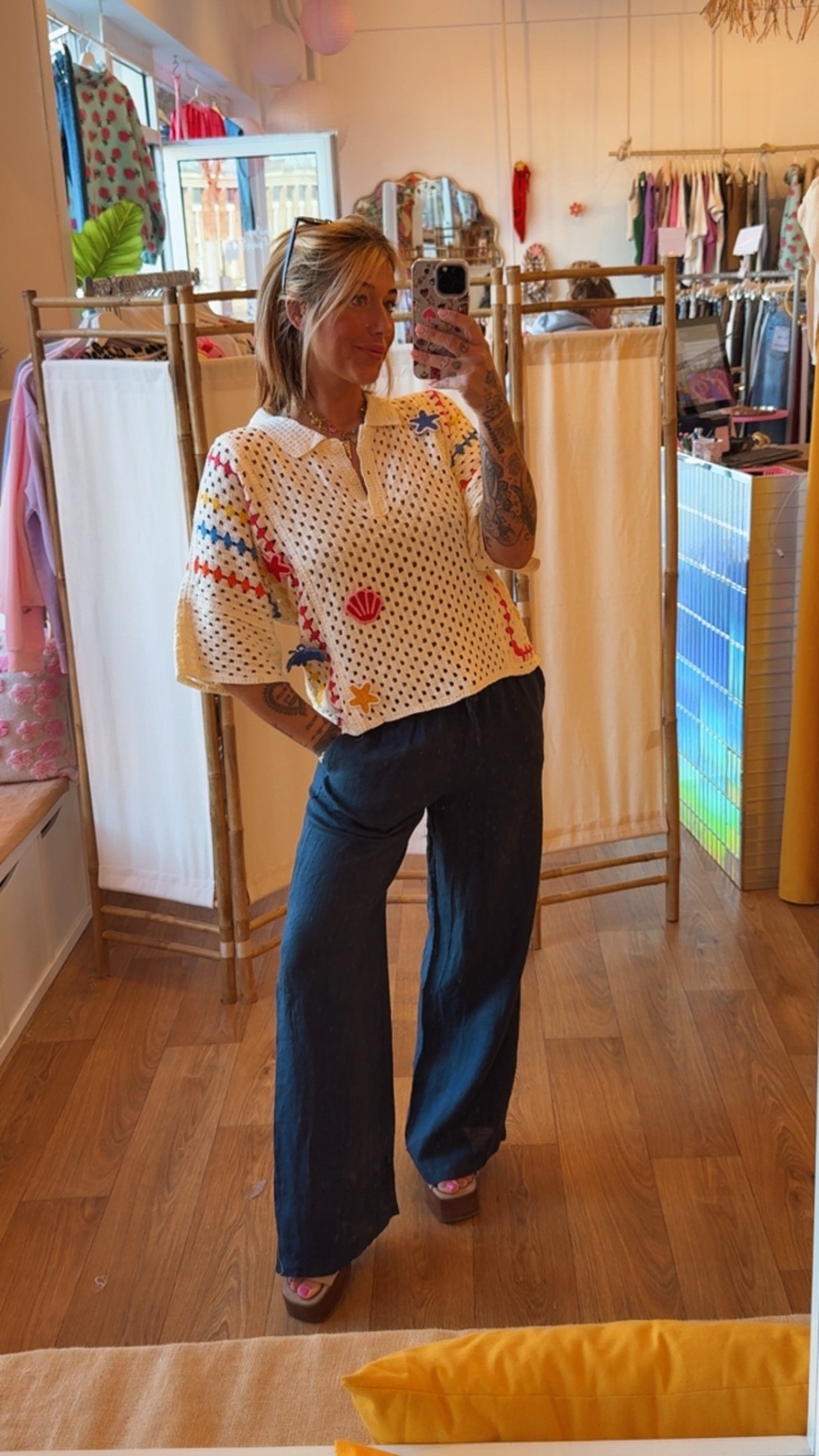 / PANTALON EN LIN DROIT BLEU MARINE
